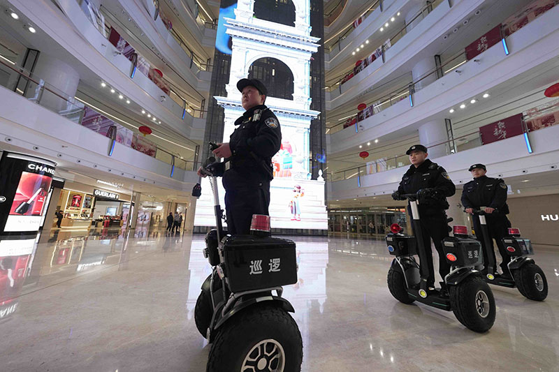 图为湖北省武汉市公安局武昌区分局梅苑派出所民警驾驶平衡车在武商梦时代广场内部巡逻。孙逊/摄