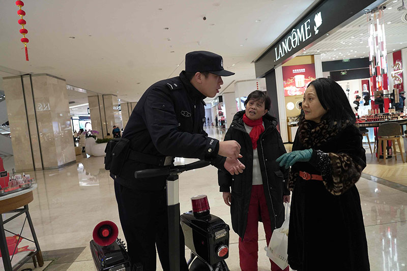 春节期间,湖北省武汉市公安局武昌区分局梅苑派出所民警肖楠和同事用心守护武商梦时代广场的平安。