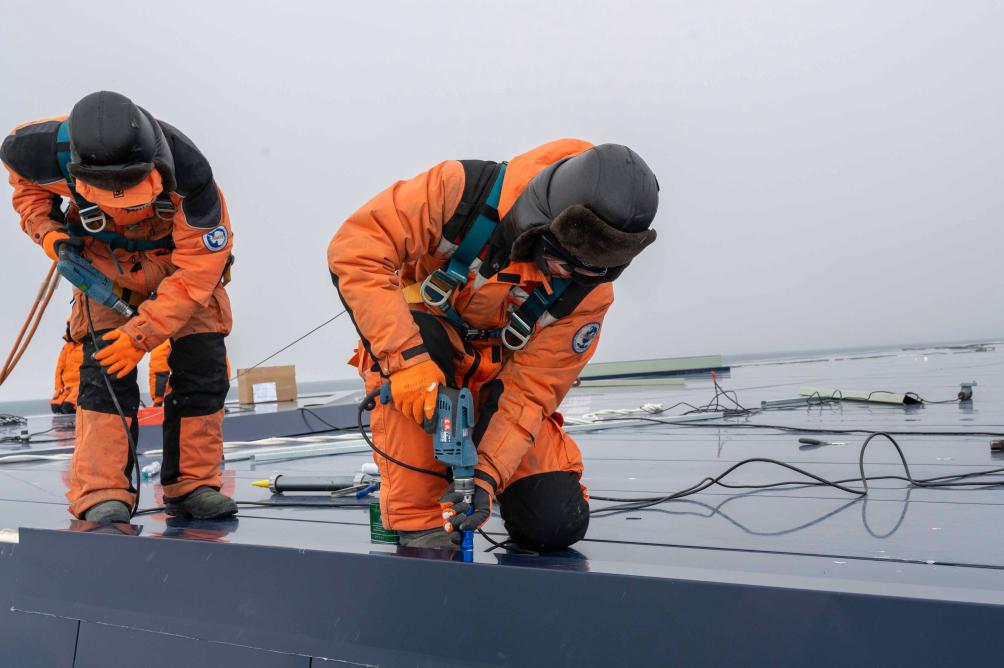 中国第40次南极考察队员谢帅帅(右一)在工作中。新华社记者周圆 摄