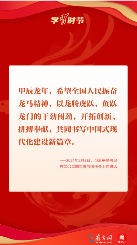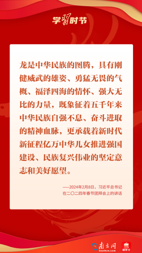 近年来,习近平总书记在多个场合以“龙”鼓舞人心、催人奋进。在前不久的2024年春节团拜会上,习近平总书记发表重要讲话时指出:“甲辰龙年,希望全国人民振奋龙马精神,以龙腾虎跃、鱼跃龙门的干劲闯劲,开拓创新、拼搏奉献,共同书写中国式现代化建设新篇章。”