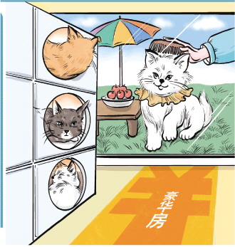 在了解寄养房间的规格后,她更加震惊:标准间就是一个宠物柜,一大排柜子排在一起,空间不是很大。当她和商家说宠物平时是放养的后,商家建议她用最豪华的宠物柜,每天有3次半小时的放养“遛弯”时间,猫粮、猫罐头、猫砂等生活用品价格另算,洗澡、美容等服务价格也不包括在内。