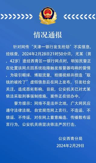中新网天津2月29日电 (周亚强)天津市公安局西青分局29日晚发布情况通报:针对网传“天津一银行发生抢劫”不实信息,经核查,2024年2月28日21时50分许,尤某(男,42岁)途经西青区一银行网点时,明知民警正在处置该网点因系统故障触发报警器鸣响的警情,为吸引眼球、博取流量,拍摄视频并捏造“取钱的被抢了”虚假信息后在网上发布,引发社会关注,造成恶劣影响。目前,公安机关已对尤某依法采取刑事强制措施,案件正在侦办中。