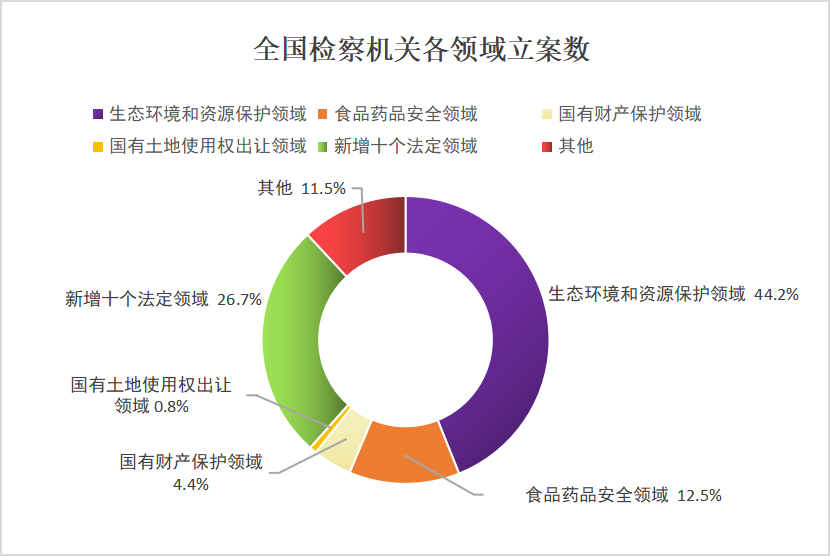 一是四大传统法定领域“基本盘”稳健。2023年,全国检察机关共办理四个领域案件117414件,占公益诉讼总数的61.8%。其中,生态环境和资源保护领域83924件、食品药品安全领域23754件、国有土地使用权出让领域1468件、国有财产保护领域8268件,分别占公益诉讼总数的44.2%、12.5%、0.8%和4.4%。
