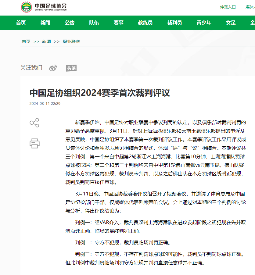 11日评议会结束后不久,中国足协在官网公布评议结果。未来,这将成为中国足协裁判评议工作的常态。