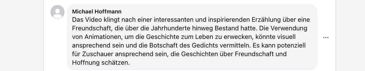 德语网友留言:“这段视频讲述的是一段历久弥新的友谊,听起来既有趣又鼓舞人心。使用动画将故事栩栩如生地展现出来,既具有视觉吸引力,又能传达诗歌的信息”。