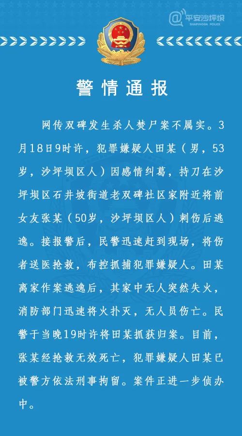 通报称,3月18日9时许,犯罪嫌疑人田某(男,53岁,沙坪坝区人)因感情纠葛,持刀在沙坪坝区石井坡街道老双碑社区家附近将前女友张某(50岁,沙坪坝区人)刺伤后逃逸。