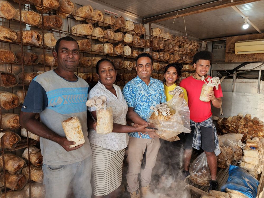 2022年5月11日,在斐济第三大城市楠迪,一家斐济蘑菇公司员工展示在中国援斐菌草技术示范中心项目帮助下种植的蘑菇。新华社记者 张永兴 摄