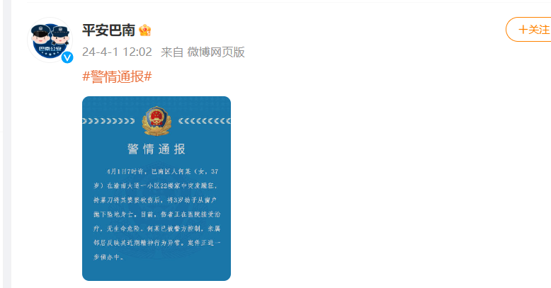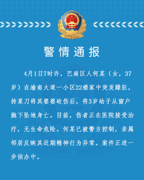重庆警方:一女子突发躁狂,砍伤婆婆后将3岁幼子扔下楼