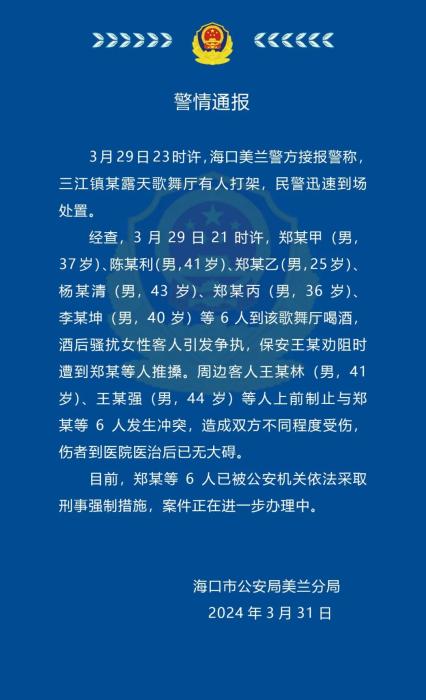 中新网4月1日电 据“海南警方”微信公众号消息,海口市公安局美兰分局3月31日发布警情通报,3月29日23时许,海口美兰警方接报警称,三江镇某露天歌舞厅有人打架,民警迅速到场处置。