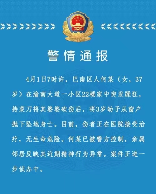 重庆市巴南区公安分局发布警情通报称,4月1日7时许,巴南区人何某(女,37岁)在渝南大道一小区22楼家中突发躁狂,持菜刀将其婆婆砍伤后,将3岁幼子从窗户抛下坠地身亡。目前,伤者正在医院接受治疗,无生命危险。何某已被警方控制,亲属邻居反映其近期精神行为异常。案件正进一步侦办中。