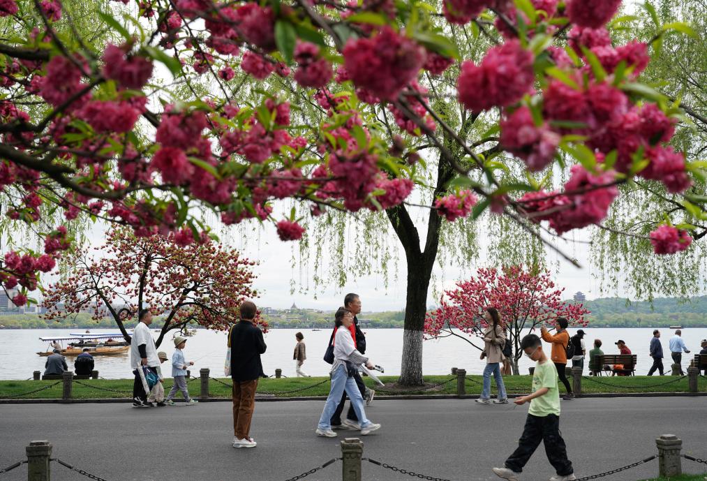 4月3日,游客走在杭州西湖白堤上。新华社记者 韩传号 摄