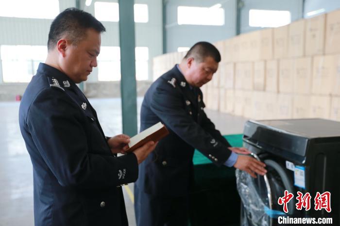 4月18日,民警正在巨野县一仓库内查验涉案洗衣机。梁犇摄
