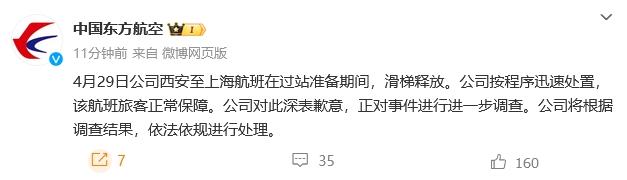 中新网4月30日电 据中国东方航空微博消息,4月29日公司西安至上海航班在过站准备期间,滑梯释放。公司按程序迅速处置,该航班旅客正常保障。公司对此深表歉意,正对事件进行进一步调查。公司将根据调查结果,依法依规进行处理。