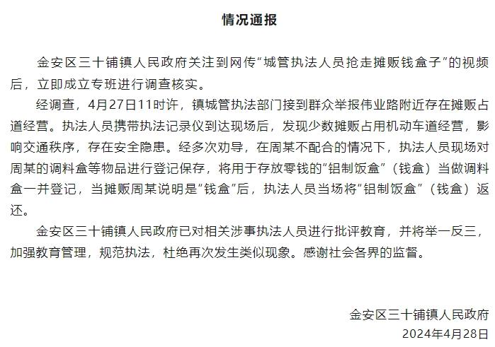 中新网4月29日电 据“六安发布”微信公众号消息,安徽省六安市金安区三十铺镇人民政府28日发布情况通报,金安区三十铺镇人民政府关注到网传“城管执法人员抢走摊贩钱盒子”的视频后,立即成立专班进行调查核实。