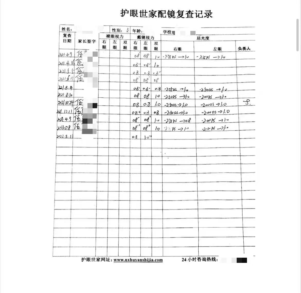 孩子配戴该眼镜的一年多来,任女士感觉孩子的视力没有以前那么好了,但在平罗县护眼世家复查视力时并未发现度数上涨。2022年8月,任女士带孩子去医院复查。检查报告显示,孩子右眼上涨了125度、左眼上涨了25度,且出现了斜视的情况。
