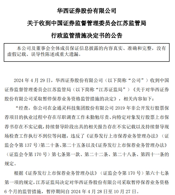 由于违反相关规定,江苏证监局决定对华西证券采取暂停保荐业务资格6个月的监管措施,暂停期间自2024年4月28日至10月27日。