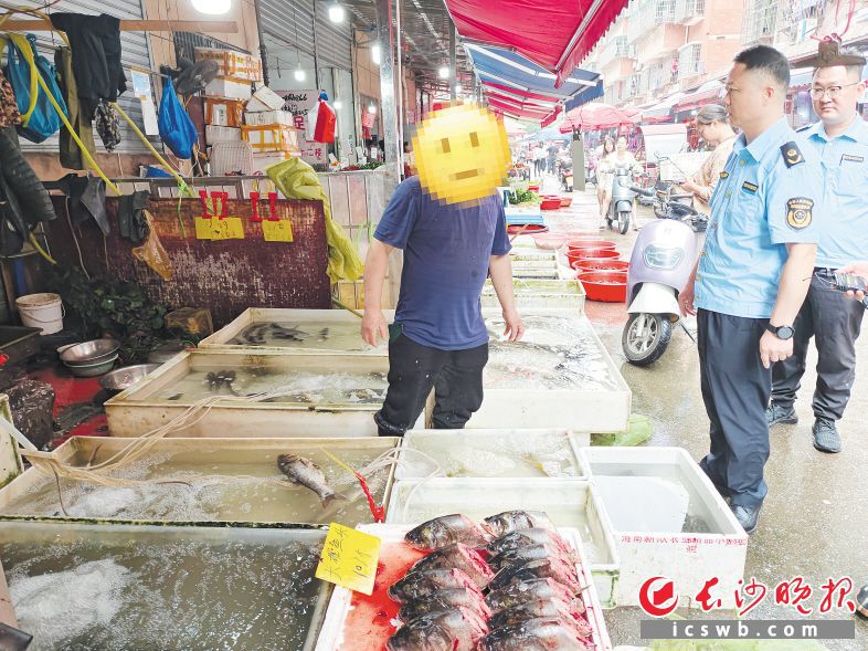 市场监督执法人员对摊主进行了严厉批评教育,并当场责令其将弄虚作假的死鱼进行处理。长沙晚报全媒体记者 何乐 摄
