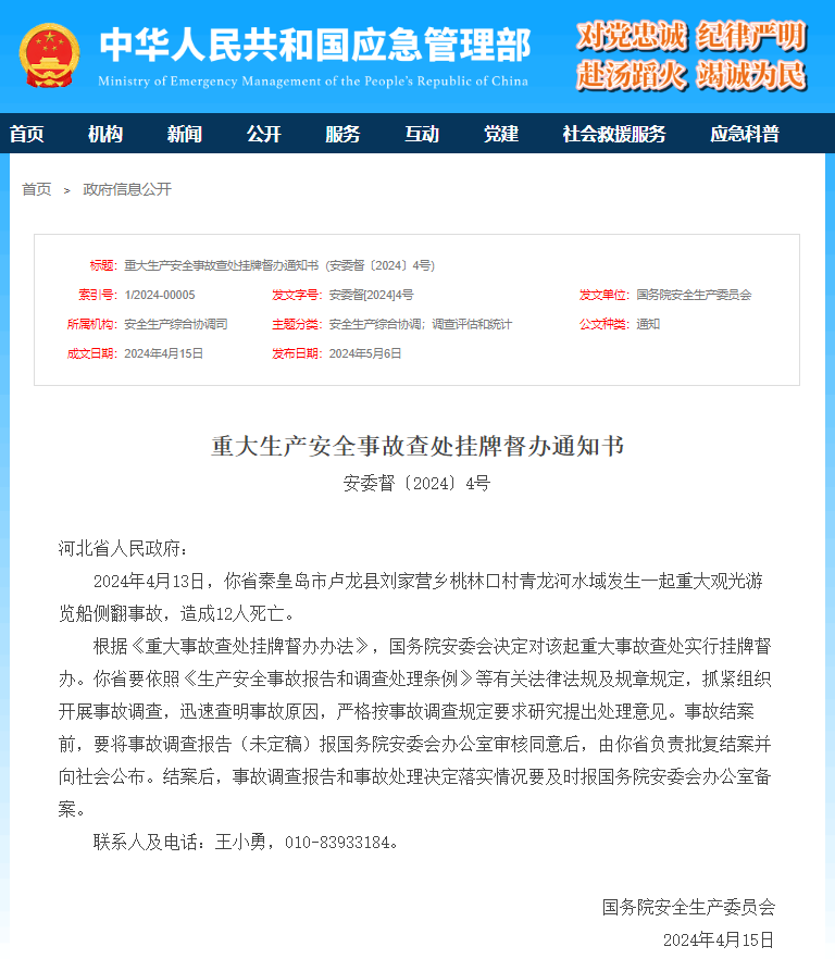 2024年4月13日,你省秦皇岛市卢龙县刘家营乡桃林口村青龙河水域发生一起重大观光游览船侧翻事故,造成12人死亡。