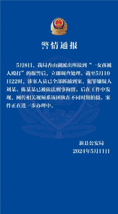 中新网5月11日电 河南新县市公安局11日在官方微信公众号发布警情通报称,5月8日,新县市公安局香山湖派出所接到“一女孩被人殴打”的报警后,立即调查处理。