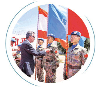 图为在黎巴嫩南部地区辛尼亚村中国维和营,联合国驻黎巴嫩临时部队官员为中国维和官兵佩戴“和平荣誉勋章”。 新华社发 李竹林 摄
