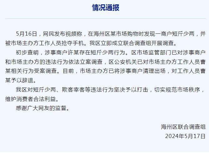 初步查明,涉事商户许某存在短斤少两行为。海州区市场监管部门已对涉事商户和市场主办方的违法行为依法立案调查,海州区公安机关已对市场主办方工作人员曹某相关行为受案调查。目前,市场主办方已将涉事商户清理出场,对工作人员曹某予以辞退。