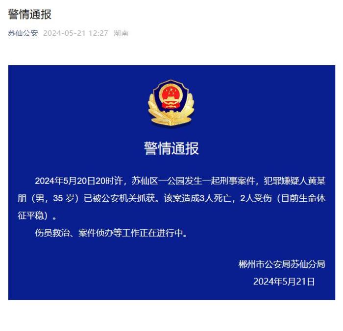 中新网5月21日电 湖南郴州市公安局苏仙分局21日在官方微信公众号发布警情通报称,5月20日20时许,苏仙区一公园发生一起刑事案件,犯罪嫌疑人黄某朋(男,35岁)已被公安机关抓获。
