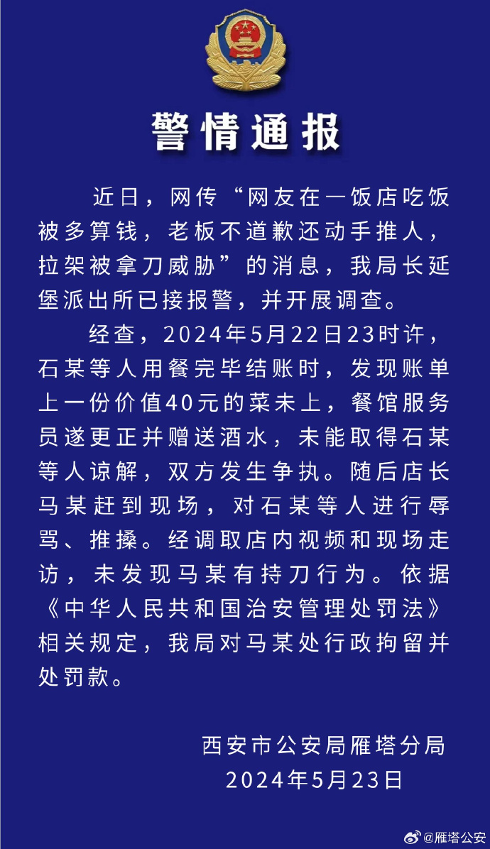 中新网5月24日电 西安市公安局雁塔分局23日在官方微博发布警情通报称,近日,网传“网友在一饭店吃饭被多算钱,老板不道歉还动手推人,拉架被拿刀威胁”的消息,该局长延堡派出所已接报警,并开展调查。