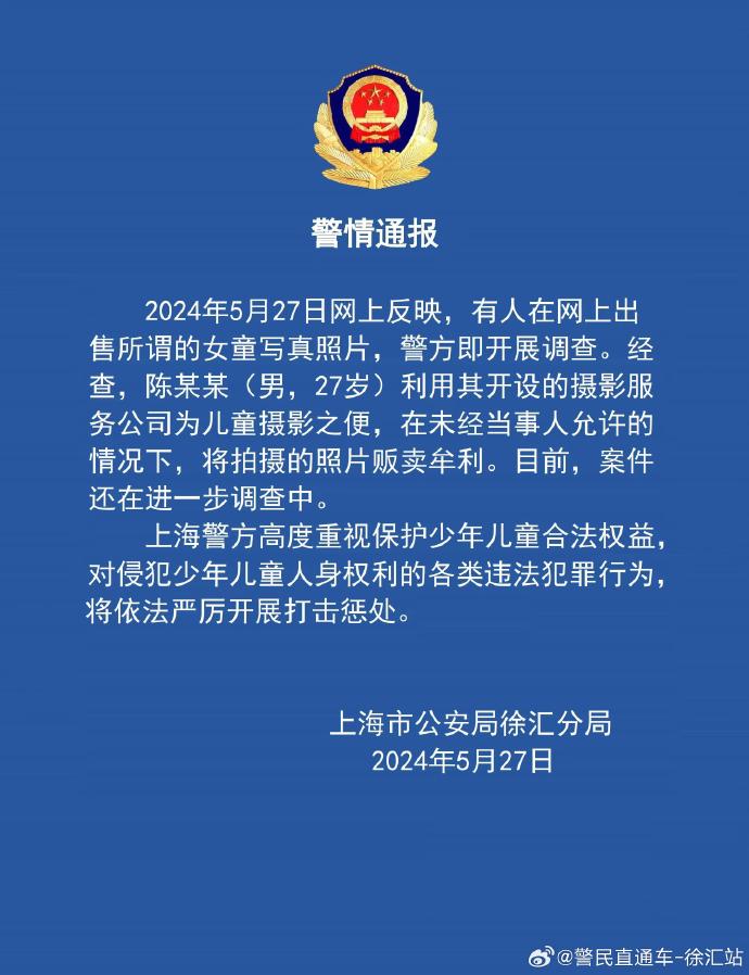 中新网5月28日电据上海市公安局徐汇分局官方微博消息,5月27日网上反映,有人出售所谓的女童写真照片,警方即开展调查。经查,陈某某(男,27岁)利用其开设的摄影服务公司为儿童摄影之便,在未经当事人允许的情况下,将拍摄的照片贩卖牟利。目前,案件还在进一步调查之中。