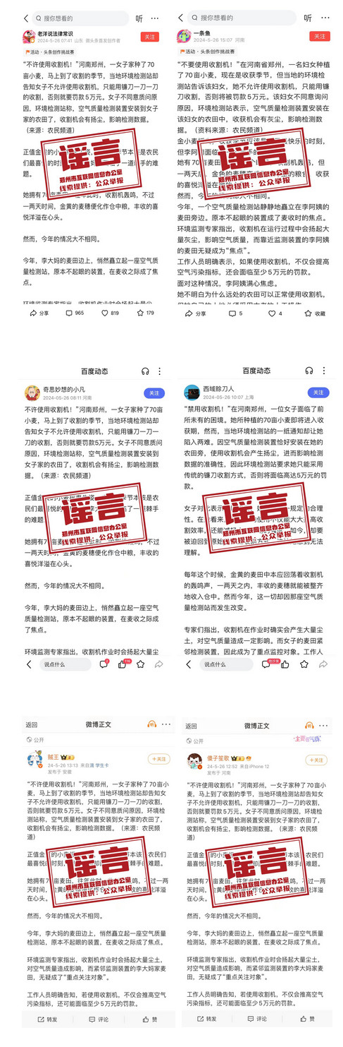 5月26日,网络平台用户“老洋说法律常识”发布信息称,“河南郑州,一女子家种了70亩小麦,马上到了收割的季节,当地环境检测站却告知女子不允许使用收割机,只能用镰刀一刀一刀的收割。”随后,网络平台用户“一条鱼”“奇思妙想的小凡”“西域赊刀人”“贼王”“傻子笙歌”等多个账号转发相关信息。