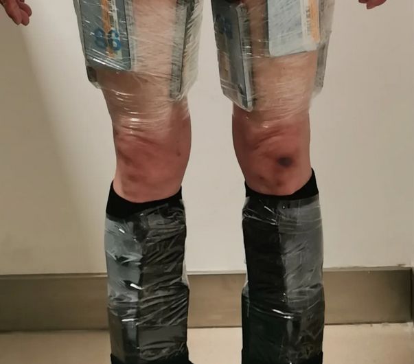 5月24日8时许,一名身穿墨蓝色条纹衬衫的旅客从青茂口岸旅检现场“无申报通道”进境,现场关员察觉其神情异常,遂将其拦截。经查验,关员在该旅客腰腹部、大腿及小腿部发现用塑料膜、弹力绷带绑藏的旧苹果牌手机,共计52台。