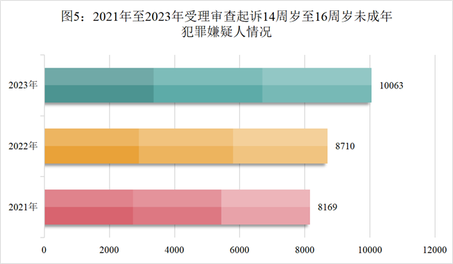 (2)办理低龄未成年人犯罪人数呈上升趋势。2023年,全国检察机关受理审查起诉14周岁至16周岁的未成年犯罪嫌疑人10063人,同比上升15.5%。