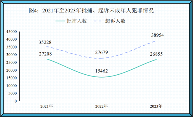 (1)批捕、起诉未成年人犯罪总体上升。2023年,坚持“教育、感化、挽救”方针和“教育为主、惩罚为辅”原则,认真贯彻“预防就是保护,惩治也是挽救”的理念,全国检察机关共批准逮捕未成年犯罪嫌疑人26855人,起诉未成年犯罪嫌疑人38954人,同比分别上升73.7%、40.7%。
