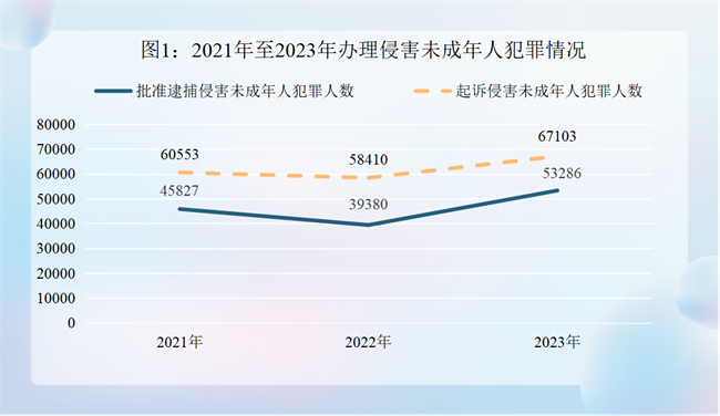 (1)办理侵害未成年人犯罪案件总体有所上升。2023年,全国检察机关共批准逮捕侵害未成年人犯罪53286人,提起公诉67103人,同比分别上升35.3%、14.9%。其中,起诉未成年犯罪嫌疑人侵害未成年人16972人,同比上升24.9%,占侵害未成年人犯罪的25.3%。