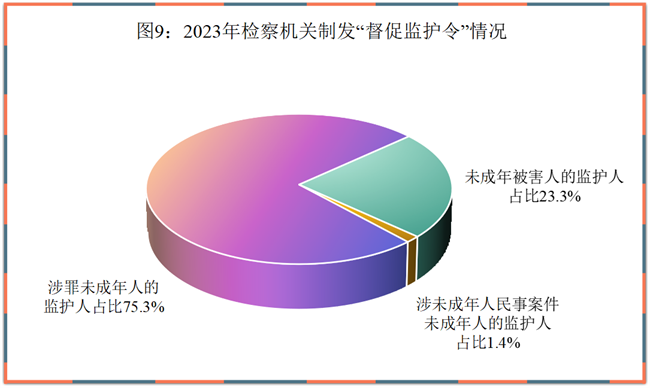 1. 开展“督促监护令”工作情况。2023年,全国检察机关结合办案,针对性督促、引导监护人履行监护职责,共制发“督促监护令”5.7万份。其中,向涉罪未成年人的监护人制发“督促监护令”4.3万份,向未成年被害人的监护人制发“督促监护令”1.3万份,探索向涉未成年人民事案件未成年人的监护人制发“督促监护令”800余份。