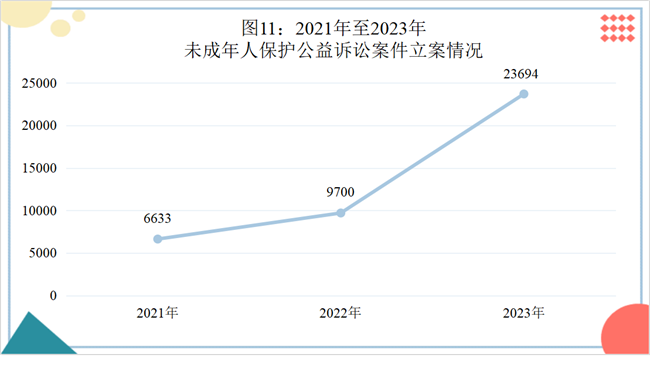 2023年,全国检察机关共立案办理未成年人保护公益诉讼案件23694件,同比上升1.4倍。其中,提出行政公益诉讼检察建议13706件,民事公益诉讼起诉58件。