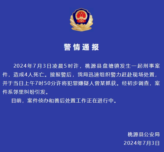 中新网7月4日电 湖南常德桃源县公安局3日在官方微信号发布通报,2024年7月3日凌晨5时许,桃源县盘塘镇发生一起刑事案件,造成4人死亡。接报警后,该局迅速组织警力赶赴现场处置,并于当日上午7时50分许将犯罪嫌疑人曾某初抓获。经初步调查,案件系邻里纠纷引发。