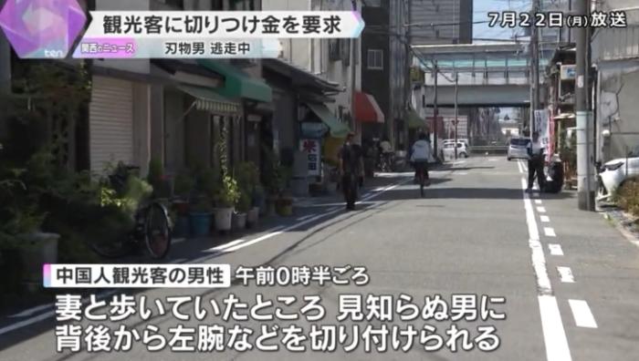 当地警方称,案发前,该游客正和其妻子在此花区四贯岛的街上散步,突然被身后一名男子用小刀刺伤左腕,并被勒索现金。受伤男子反抗后,嫌犯随即逃走。