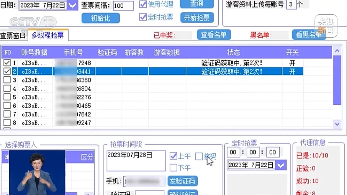 北京市海淀区人民检察院科技犯罪检察团队检察官白磊:为了让“抢票手”“键盘手”更好抢号,把“抢票软件”做得看来很傻瓜化的,包括游客资料,抢号时间分上午还是下午,总票源以及抢号用的手机号。暴力下单模式,抢号的频率可能会很快。