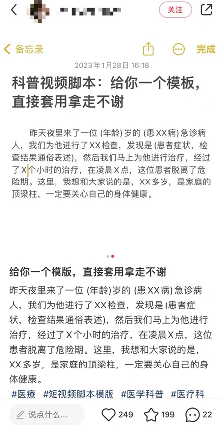 后来有网友发现,同样“温暖人心”的故事,出现在全国数十位医生的自媒体账号上。这些故事剧情高度相似,连视频开头的话都是相同的。后来,郭某在接受媒体采访时承认,这些内容系其宣传团队“添油加醋”所致,拍摄时他只是照着稿子念一遍。