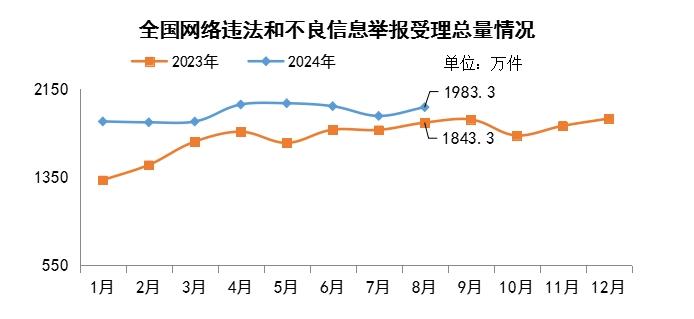 中新网9月6日电 据中央网信办举报中心微信公众号消息,2024年8月,中央网信办举报中心指导全国各级网信举报工作部门、主要网站平台受理网民举报色情、赌博、侵权、谣言等违法和不良信息1983.3万件,环比增长4.2%、同比增长7.6%。其中,中央网信办举报中心受理举报41.5万件,环比下降2.2%、同比下降19.1%;各地网信举报工作部门受理举报117.9万件,环比增长14.5%、同比增长66.6%;全国主要网站平台受理举报1823.9万件,环比增长3.7%、同比增长6%。