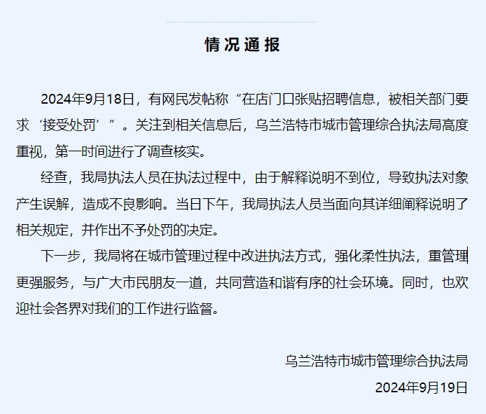 中新网9月19日电 据“乌兰浩特市微分享”微信公众号消息,2024年9月18日,有网民发帖称“在店门口张贴招聘信息,被相关部门要求‘接受处罚’”。关注到相关信息后,内蒙古自治区兴安盟乌兰浩特市城市管理综合执法局高度重视,第一时间进行了调查核实。