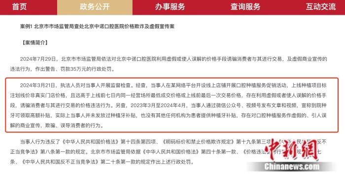 本月,北京市市场监管局公布一批民生领域案件查办“铁拳”行动典型案例。其中,因在线上对“种牙”服务进行虚假宣传,并利用虚假或使人误解的价格诱骗消费者,北京中诺口腔医院被罚款35万元。中新健康注意到,截至目前,今年北京中诺口腔医院被行政处罚8次,被处罚总金额约40.28万元。
