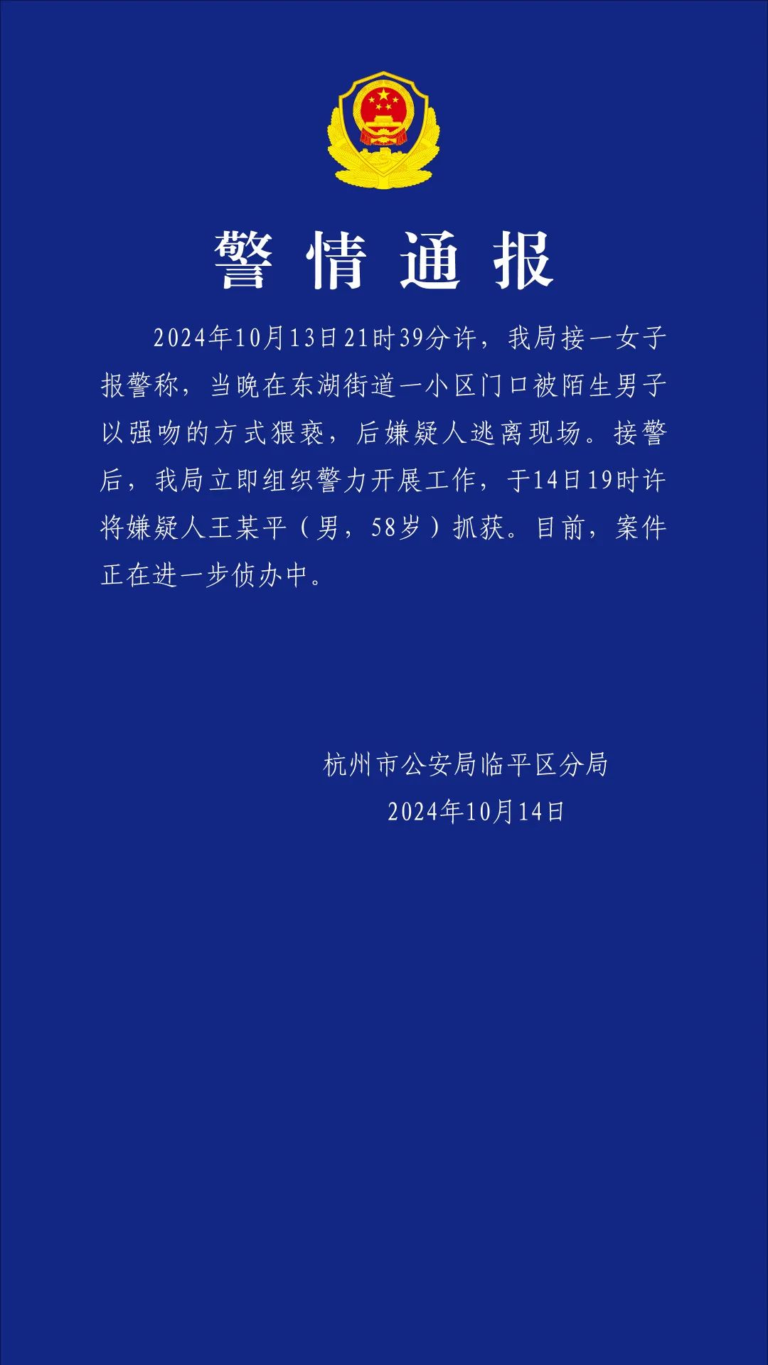 中新网10月15日电 据“临平公安”微信公众号消息,杭州市公安局临平区分局14日发布警情通报称,10月13日21时39分许,该局接一女子报警称,当晚在东湖街道一小区门口被陌生男子以强吻的方式猥亵,后嫌疑人逃离现场。接警后,该局立即组织警力开展工作,于14日19时许将嫌疑人王某平(男,58岁)抓获。目前,案件正在进一步侦办中。