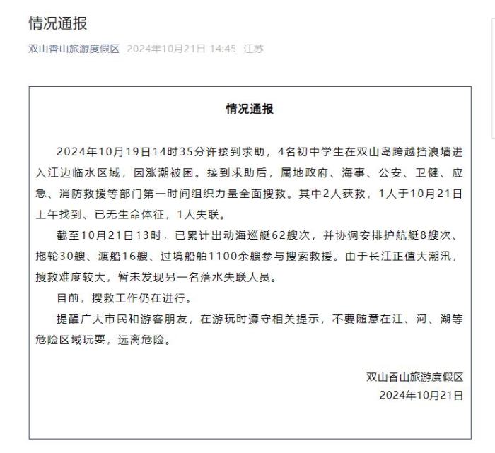 中新网10月21日电 据“双山香山旅游度假区”微信公众号消息,江苏张家港双山香山旅游度假区21日发布通告称,10月19日14时35分许接到求助,4名初中学生在双山岛跨越挡浪墙进入江边临水区域,因涨潮被困。接到求助后,属地政府、海事、公安、卫健、应急、消防救援等部门第一时间组织力量全面搜救。其中2人获救,1人于10月21日上午找到、已无生命体征,1人失联。