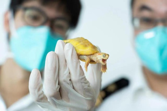 办案人员正在观察查获的红耳彩龟龟苗。拱北海关供图