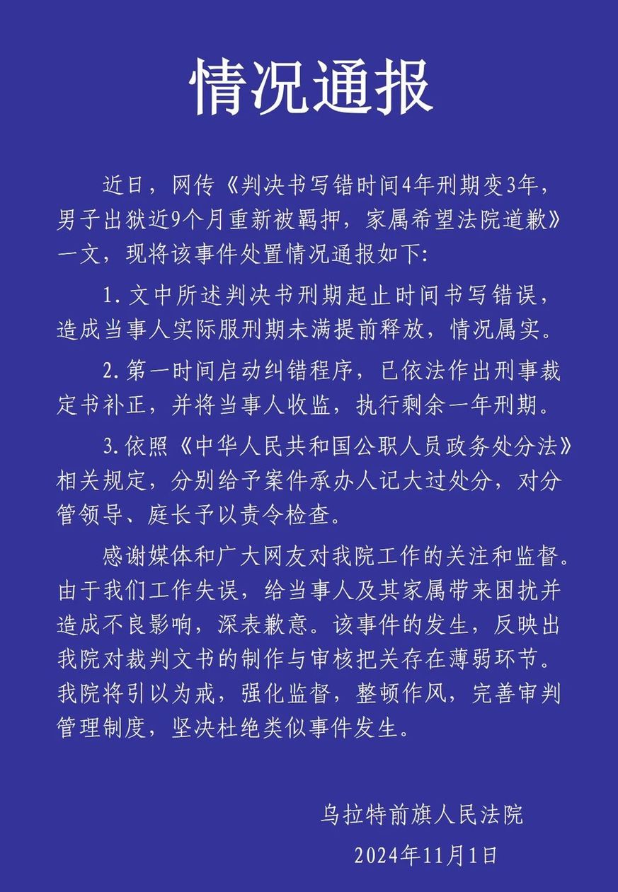 中新网11月1日电 1日,内蒙古乌拉特前旗人民法院就网传《判决书写错时间4年刑期变3年:男子出狱近9个月重新被羁押,家属希望法院道歉》发布情况通报称,文中所述判决书刑期起止时间书写错误,造成当事人实际服刑期未满提前释放,情况属实。第一时间启动纠错程序,已依法作出刑事裁定书补正,并将当事人收监,执行剩余一年刑期。