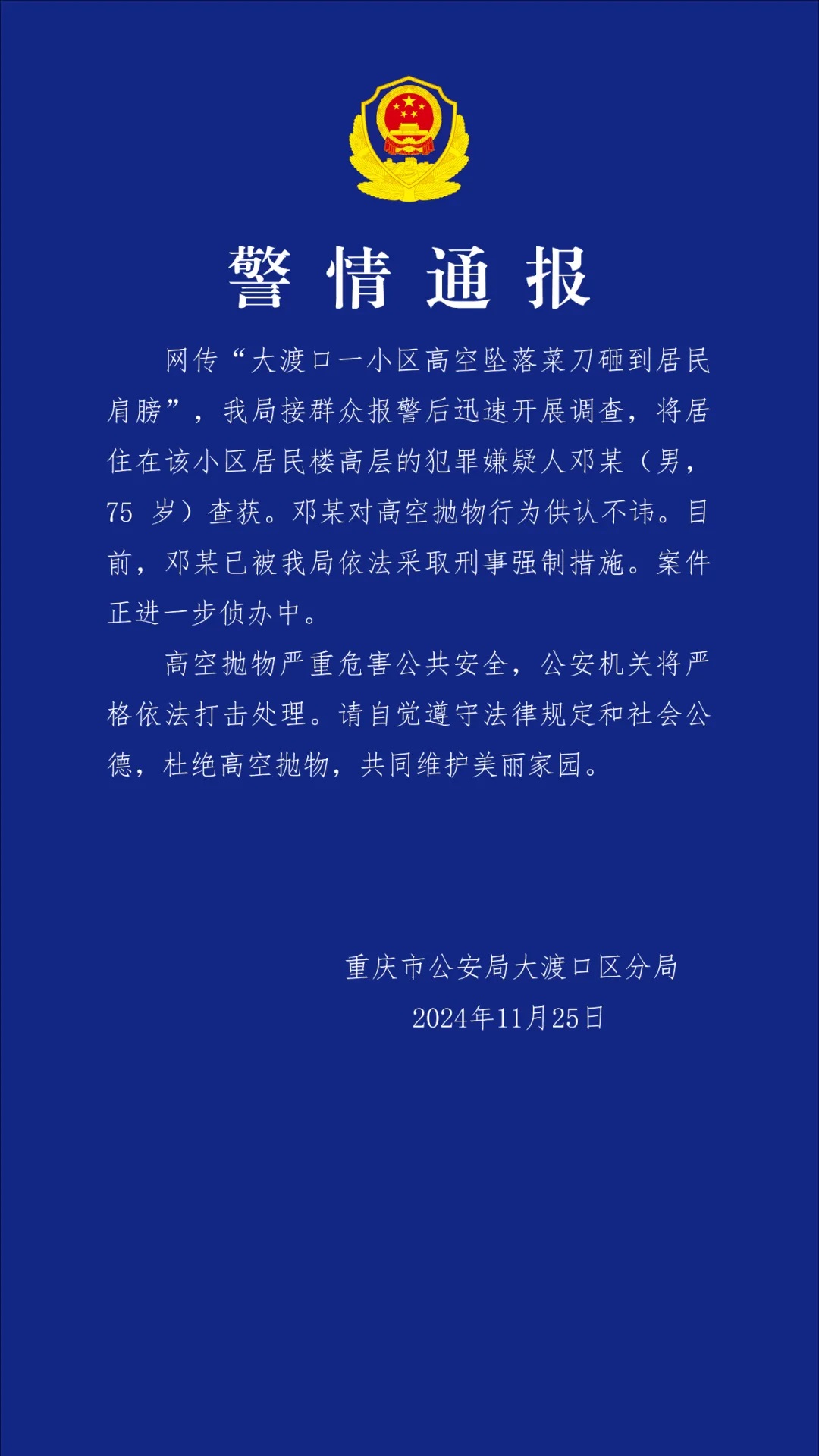 中新网11月26日电 据“平安大渡口”微信公众号消息,重庆市公安局大渡口区分局25日发布警情通报称,网传“大渡口一小区高空坠落菜刀砸到居民肩膀”,该局接群众报警后迅速开展调查,将居住在该小区居民楼高层的犯罪嫌疑人邓某(男,75岁)查获。邓某对高空抛物行为供认不讳。目前,邓某已被该局依法采取刑事强制措施。案件正进一步侦办中。