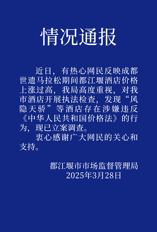 中新网3月28日电 都江堰市市场监管局3月28日通报,近日,有热心网民反映成都世遗马拉松期间都江堰酒店价格上涨过高,该局高度重视,对都江堰市酒店开展执法检查,发现“风隐天骄”等酒店存在涉嫌违反《中华人民共和国价格法》的行为,现已立案调查。