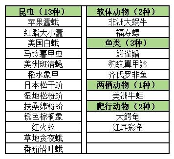 其中昆虫、软体动物、鱼类、两栖动物、爬行动物共21种