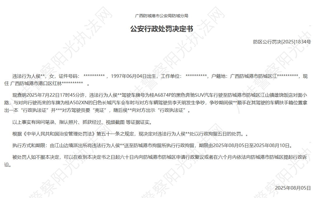 中新网8月6日电 据八桂警察阳光执法网网站消息,8月5日,广西防城港市公安局防城分局发布公安行政处罚决定书: